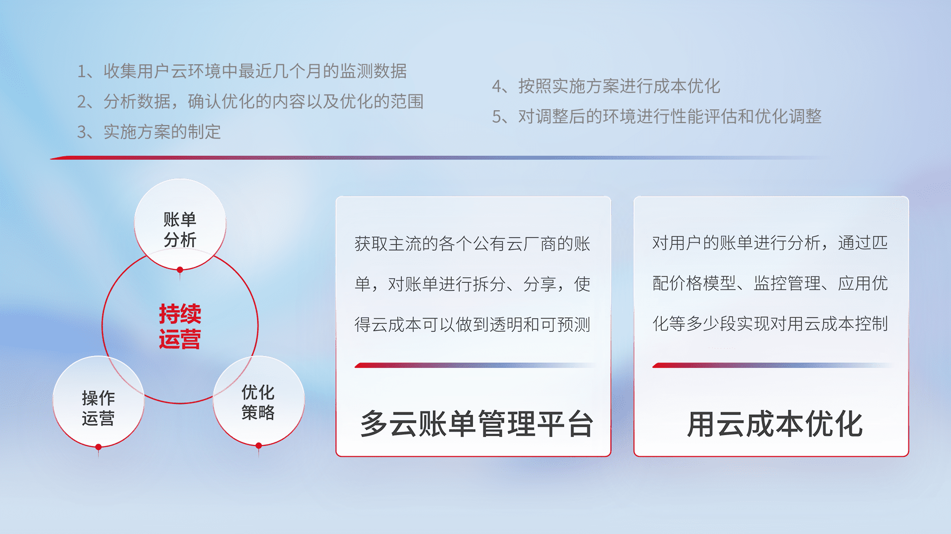 通过多云纳管,,以统一的资源数据模型把客户的云资源进行抽象和封装,,进而实现对多云资源的统一操作,,保障云资源管理的可靠性、、、稳定性与可用性。。量身定制化运维内容,,,,配置、、、、开发运维、、、、补丁管理、、、备份、、监控、、、认证和访问管理、、、审计和日常巡检等,,保障在用云过程中的可靠度,,稳定度以及高可用率。。